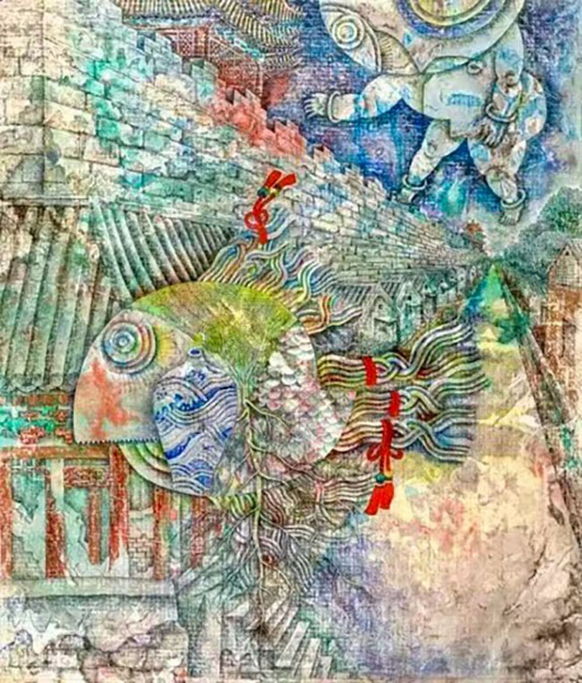 In The Moon Outside the Palace Museum Wall, the composition unfolds like a memory that refuses to stay fixed. The surface is filled with architectural fragments—walls, tiled roofs, and the recognizable structure of the Forbidden City—yet these elements are not static. They dissolve into textures, colors, and unexpected forms. A large, stylized fish floats through the scene, its body composed of intricate patterns, shifting tones, and rhythmic lines. The fish does not belong to the physical space in any literal sense, yet it feels entirely at home. It becomes a carrier of movement, perhaps even a symbol of freedom, gliding across boundaries that the built environment tries to impose.