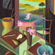 Influenced by the paintings of Frank Lloyd Wright and R. Buckminster Fuller, as well as the architecture of the 1960s and 1970s, British artist Charlotte Keates’s paintings of interiors blur the line between reality and the grotesque. Using meticulous line work, Keates creates flat compositions that reference the sunken living rooms and split-level designs of mid-century modern. From mottled floors to tiled walls, her paintings are filled with rhythmic patterns on surfaces, all awash in bright colors.